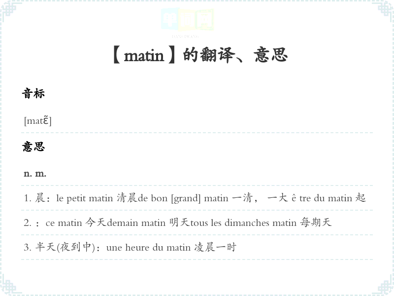 【matin】 联想:、 近义词:、 反义词: 联想词