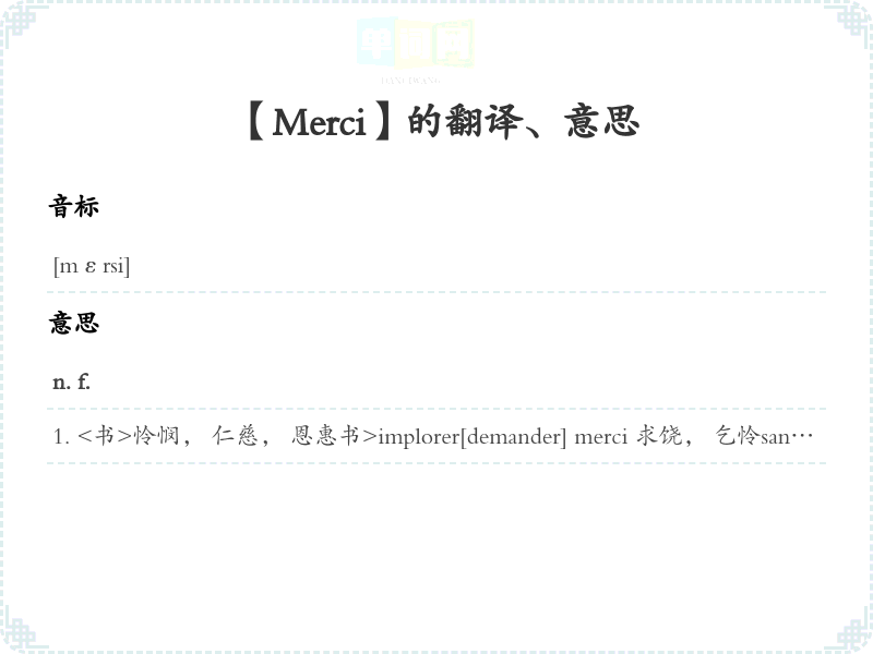 <书>怜悯, 仁慈, 恩惠书>implorer[demander] merci 求饶, 乞怜sans merci 无情地, 狠狠地, 残酷地n. m.道Dites-lui mille mercis[un grand merci] de ma part. 请替我向他多多致。interj.:Merci de votre aide 你的帮助;Sortir avec lui ? Merci bien![讽]跟他一起出去?!--(表示. 拒绝)à la merci deloc. prép.受…的支配, 任凭…的摆布tenir qn à sa merci 任意支配某人navire à la merci des vents 随风漂流的船只Dieu merciloc. adv.上帝, 天地