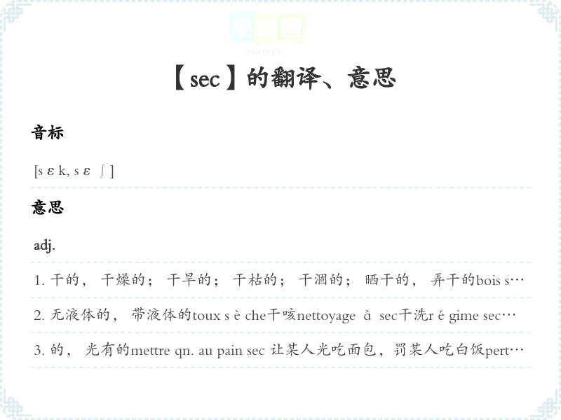 干的, 干燥的; 干旱的; 干枯的; 干涸的; 晒干的, 弄干的bois sec 干木头,干柴Le bois sec s'enflamme facilement.干柴容易着火。raisins secs 葡萄干fruit sec 水果干;<转>倒霉蛋(一般指考试及格的学生、大学毕业时未能获得文凭者以及事业上无成就者)les cheveux secs 干性头发la peau sèche 干性皮肤au sec在干燥的地方à conserver au sec在干燥处保存Le climat de cette région est sec.这个地区的气候干燥。转>