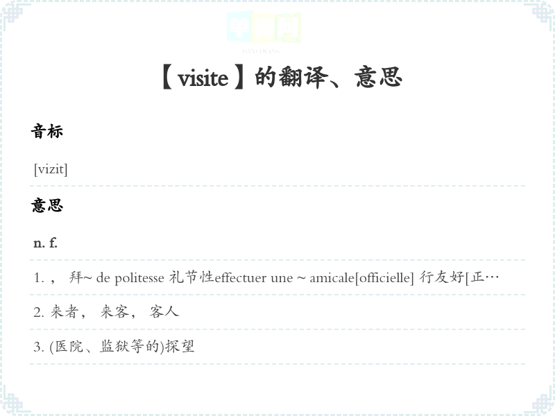 , 拜~ de politesse 礼节性effectuer une ~ amicale[officielle] 行友好[正式]rendre une ~ à qn, rendre à qn sa ~ 回拜某人, 回某人rendre ~ [faire une ~] à qn 某人, 拜某人, 拜会某人recevoir la ~ de qn 接待某人的来être en ~ chez qn 在某人家里做客carte de ~ 名片droit de ~ aux enfants 【法】离婚夫妻对子女的探望权
