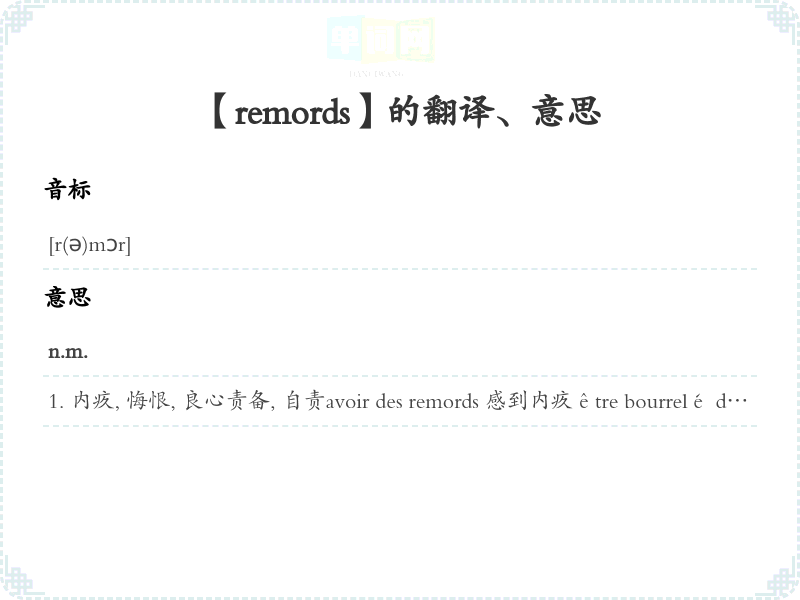 【remords】 联想:、 近义词:、 反义词: 联想词
