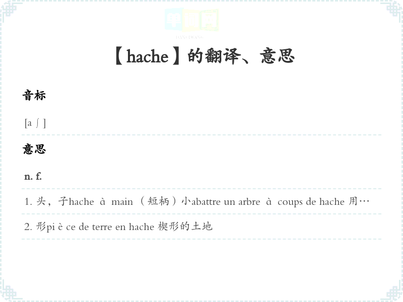 头,子hache à main (短柄)小abattre un arbre à coups de hache 用头砍刀一棵树porter la hache dans une administration <转>精减政府机构转>
