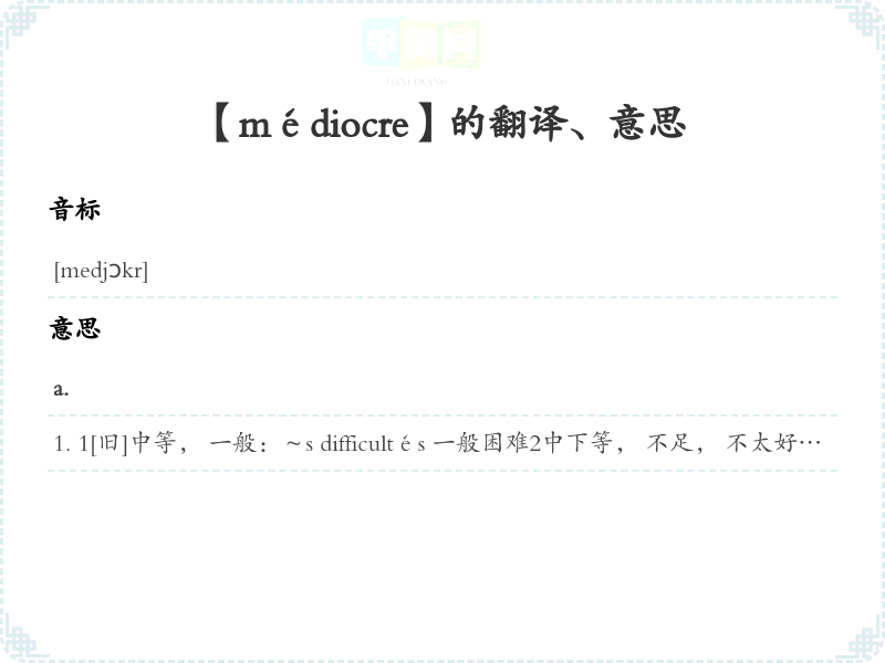 【médiocre】 助记:、 联想:、 近义词:、 反义词: 联想词