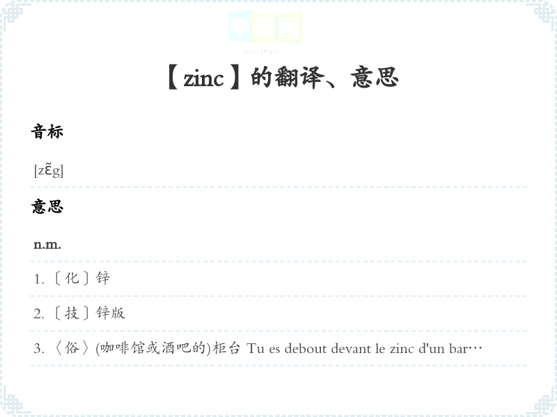 【zinc】是什么意思、字义解释