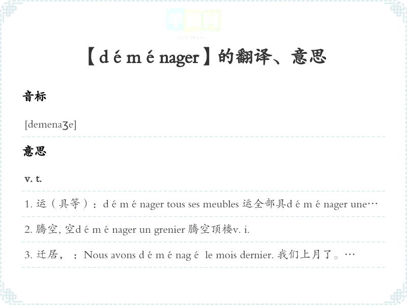 迁居, :Nous avons déménagé le mois dernier. 我们上月了。 déménager à la cloche de bois 悄悄地faire déménager qn [俗]把某人撵走