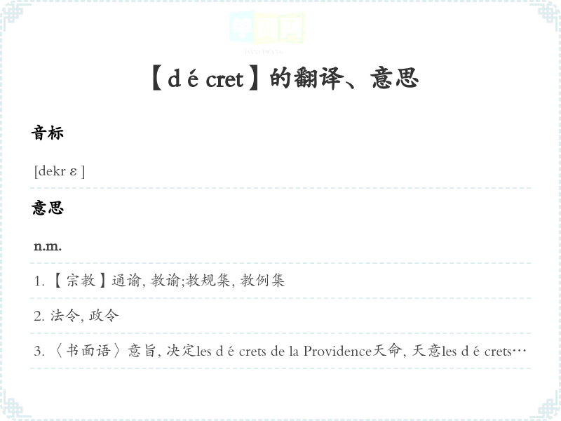 【décret】 派生:、 动词变化:、 近词: 联想词