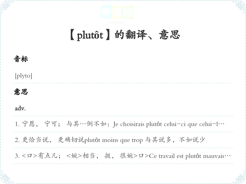 宁愿, 宁可; 与其…倒不如:Je choisirais plutôt celui-ci que celui-là. 我宁愿要个, 不要那个。 Plutôt mourir!宁愿死!Il déclame plutôt qu'il ne chante. 与其说他在唱歌, 倒不如说他在朗诵。 Je préfère t'appeler plutôt que(de)t'écrire. 给你写信, 我还不如给你打电话。 ne. . . pas plutôt que刚…就…:Je ne fus pas plutôt parti qu'il arriva. 我刚走, 他就来了。 mais plutôt(不…)而…:Il ne dormait pas, mais plutôt sommeillait. 他不在睡觉, 而在打瞌睡。 Ce n'est pas lui, mais bien plutôt elle qui en porte la responsabilité. 要负责任的不他, 而应。