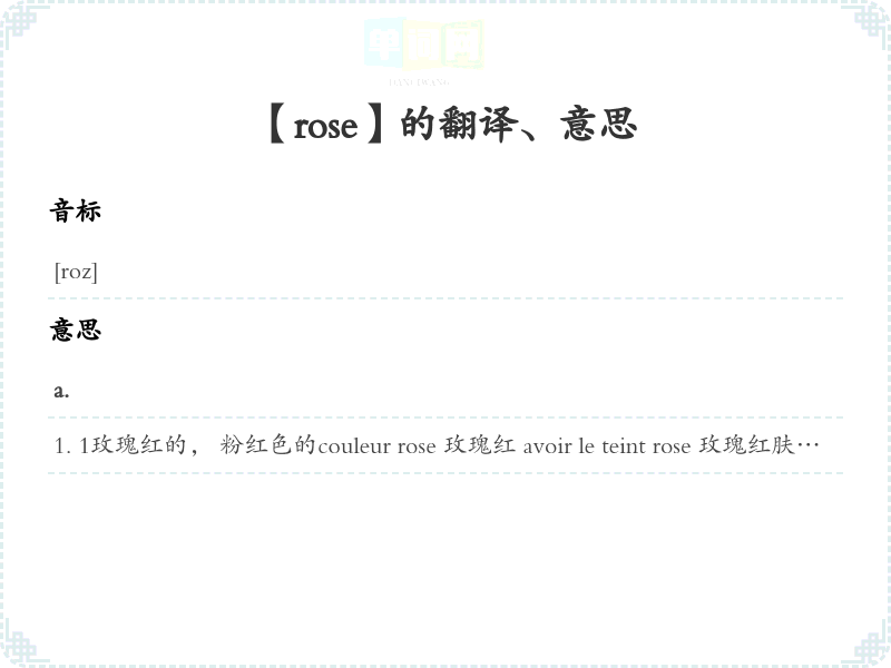 1玫瑰红的, 粉红色的couleur rose 玫瑰红 avoir le teint rose 玫瑰红肤色2色情的, 色的3社会党的[由社会党党徽而得名]n. m玫瑰红, 粉红色, 蔷薇色aimer le rose 喜欢玫瑰红n. f.玫瑰, 蔷薇, 月季;rose blanche 白玫瑰 欢乐; être sur des roses 生活得愉快、舒适圆饰, 圆窗