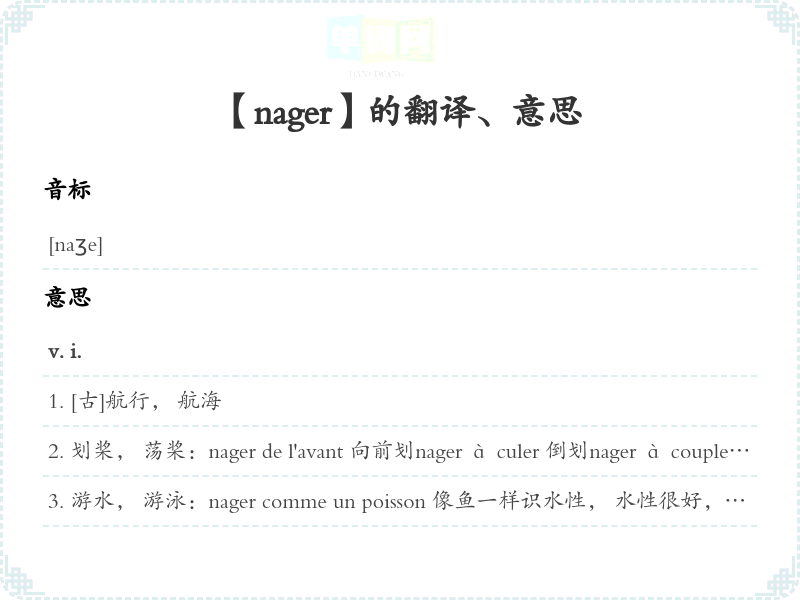 游水, 游泳:nager comme un poisson 像鱼一样识水性, 水性很好, 游得很好nager sous l'eau 潜泳nager entre deux eaux 潜泳; []周旋于双方之间savoir nager []善于随机应变, 善于周旋nager contre le courant 逆水游泳; []逆流而行nager dans les eaux de qn []跟某人意见一致, 站在某人一边