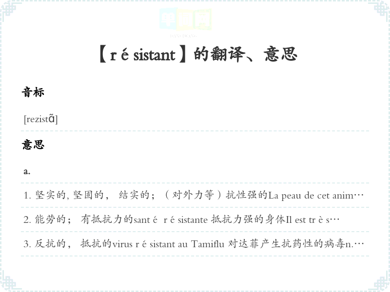 坚实的, 坚固的, 结实的;(对外力等)抗性强的La peau de cet animal est ferme et résistante. 这种动物的皮肤坚硬又结实。plante résistante au froid 寒植物matériau résistant à des grandes érosions 抗侵蚀材料