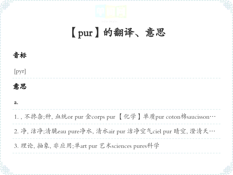 , 不搀杂;种, 血统or pur 金corps pur 【化学】单质pur coton棉saucisson pur porc猪肉灌肠couleur pure色son purrace pure种cheval de pur sang血种马