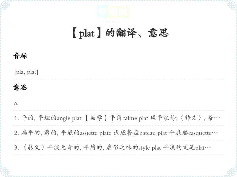 平的, 平坦的angle plat 【数学】平角calme plat 风平浪静;〈转义〉, 条 [指金融、商业等方面]rimes plates 平韵teinte plate 均匀单一的颜色terrain plat 平地toit plat 平屋顶