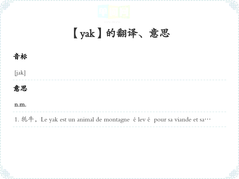 【yak】 助记:、 词根:、 联想、 名词化:、 词化:、 形容词化:、 近义词、 反义词、 同音、近音词 联想词