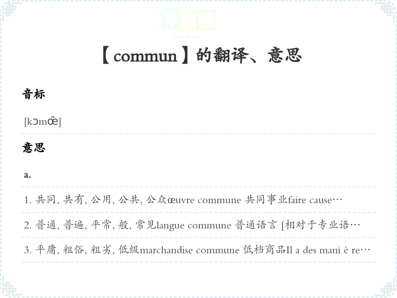 普通, 普遍, 平常, 般, 常见langue commune 普通语言 [相对于专业语言]mots communs de la langue 语言中普通词汇 [相对于专业词汇]erreur commune 常见错误nom commun 【语言】普通名词droit commun 【法律】普通法métal commun 普通金属 [与稀有金属相对]lieu commun 陈词滥调, 老套, 老生常谈sens commun 常识peu commun 与众不同, 非凡[用作 n.m.]hors du commun 不同寻常, 卓越, 杰出