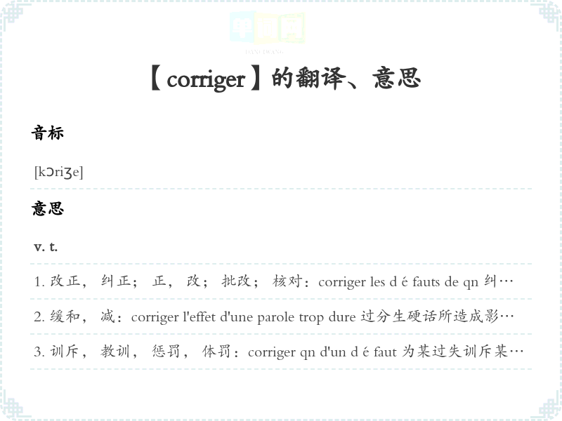 改正, 纠正; 正, 改; 批改; 核对:corriger les défauts de qn 纠正某人缺点corriger les styles de travail erronés 纠正不正之风corriger un devoir 批改作业corriger une œuvre 改作品corriger la route d'un bâtiment [海]正船航向corriger une épreuve [印]校对校样