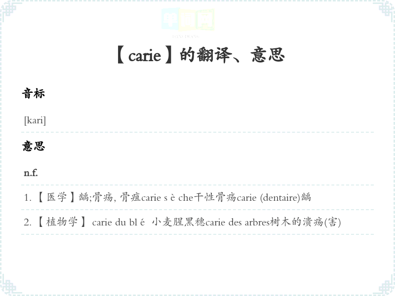 【植物学】 carie du blé 小麦腥黑穗carie des arbres树木的溃疡(害)
