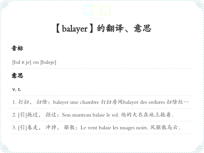 打扫, 扫除:balayer une chambre 打扫房间balayer des ordures 扫除垃圾balayer la neige 扫雪