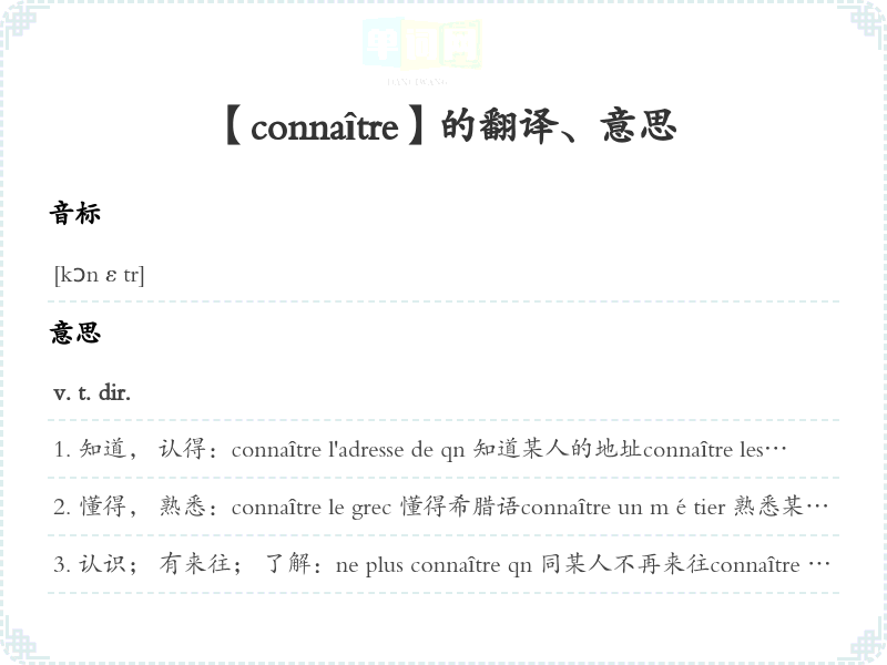认识; 有来往; 了解:ne plus connaître qn 同某人不再来往connaître qn de vue 和某人面熟se faire connaître 自我介绍; 引人注意自己; 使自己出名Je ne connais pas cet auteur. 我不知道这个作家。 我没听说过这个作家。 Je ne le connais ni d'Eve ni d'Adam. [俗]我根本不认得他。