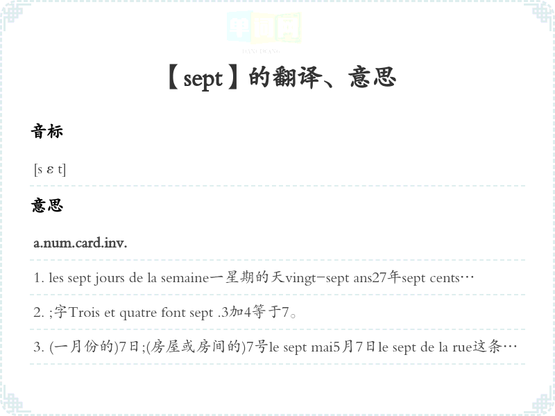 les sept jours de la semaine一星期的天vingt-sept ans27年sept cents hommes700— a.num.ord.inv.page sept 7页Charles sept [VII]查理世— n.m.inv.