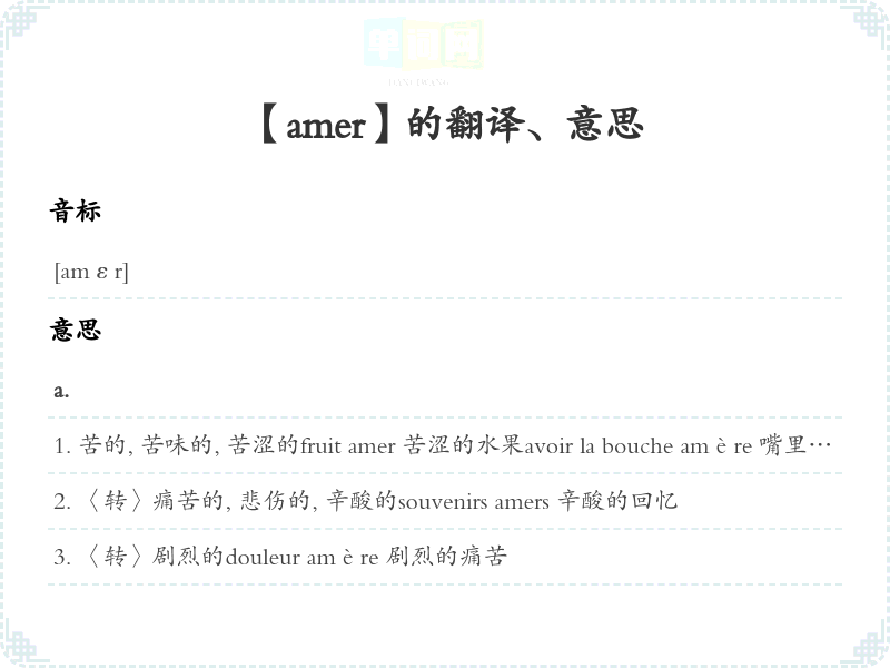 苦的, 苦味的, 苦涩的fruit amer 苦涩的水果avoir la bouche amère 嘴里发苦l'onde amer ère, les flots amers〈诗歌用语〉大海