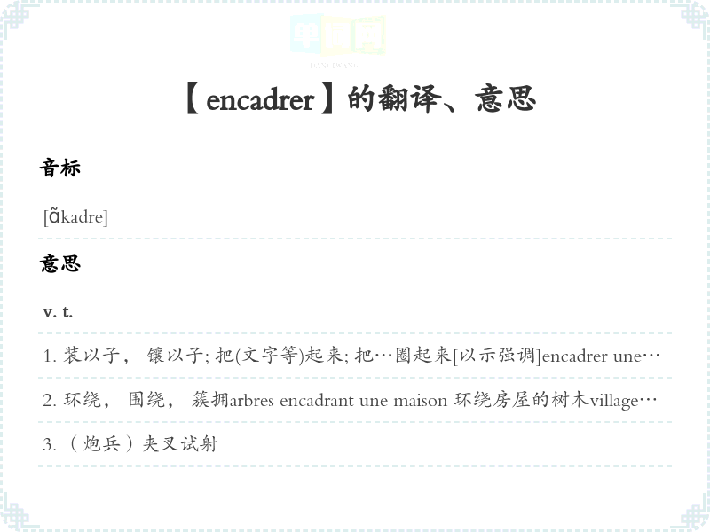 装以子, 镶以子; 把(文字等)起来; 把…圈起来[以示强调]encadrer une peinture 把画装在画C'est à encadrer. []值得配个镜挂起来