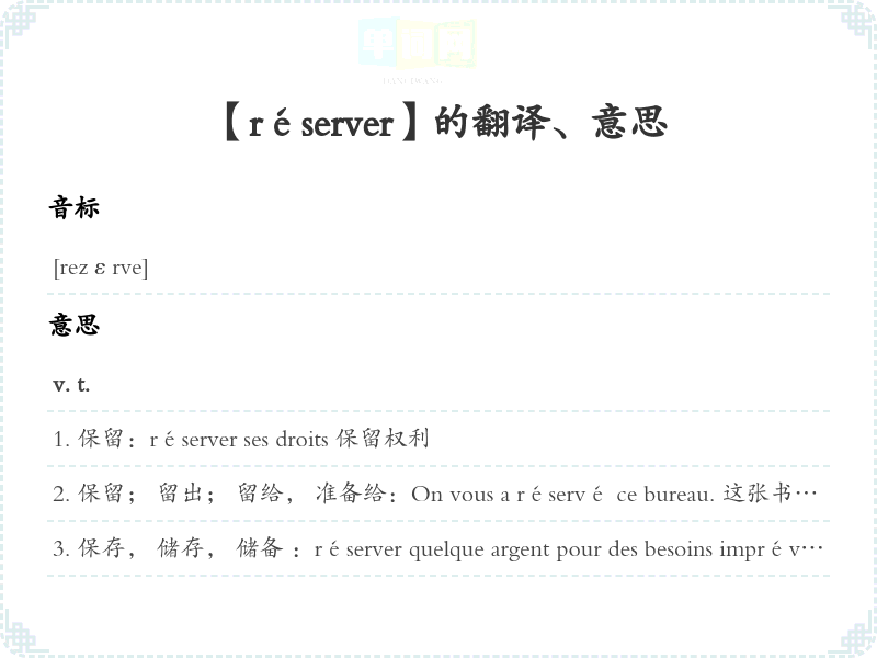 保留; 留出; 留给, 准备给:On vous a réservé ce bureau. 这张书桌是留给你的。 Cette tâche difficile lui était réservée. 这个艰难的任务是给他留着的。 On lui a réservé un accueil chaleureux. 人们热烈欢迎他。 réserver l'avenir [引]保留自由行动的权利Le sort que l'auteur a réservé à l'héroïne était misérable. 作主人翁安排的命运是悲惨的。