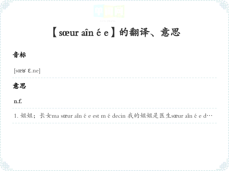 【sœur aînée】 助记:、 词根:、 联想、 名词化:、 词化:、 形容词化:、 近义词、 反义词、 同音、近音词 联想词