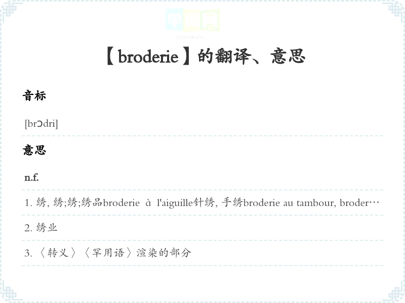 绣, 绣;绣;绣品broderie à l'aiguille针绣, 手绣broderie au tambour, broderie d'art用绷格绣faire de la broderie 绣broderie anglaise白色网眼卉绣饰