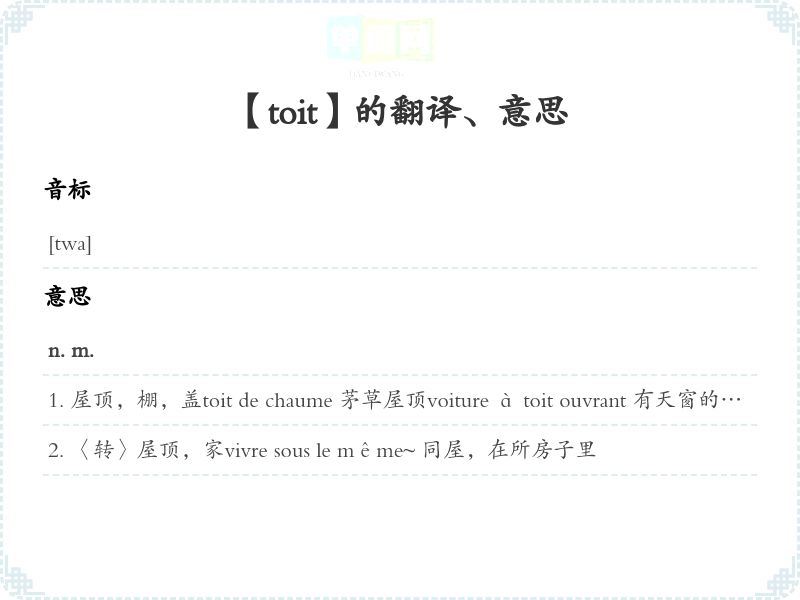 【toit】 名词变化:、 近义词:、 反义词: 联想词