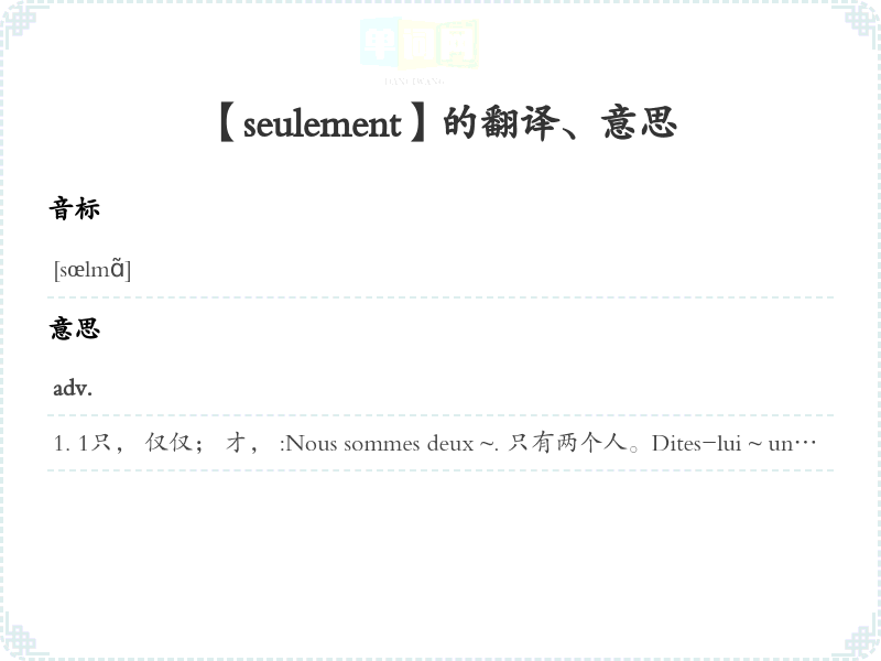 1只, 仅仅; 才, :Nous sommes deux ~. 只有两个人。Dites-lui ~ un mot. 您只要跟他说一声就行了。Je crains ~ qu'il n'arrive trop tard. 只怕他到得太晚。Il est arrivé ~ ce soir. 他今天晚上才到的。2[放在句首]不过; 可是:Venez le jour qu'il vous plaira; ~ prévenez nous. 您喜欢哪天来就哪天来,不过得预通知。3[用在否定或疑问句上]甚至:Il ne nous a pas ~ remerciés. 他连谢都没谢一下。4 si~要是…就好Si ~ vous m'aviez écrit. 您要是写封信给就好了。5[用在命令式动词后面, 表示缓和语]Essaie~!一吧!Ecoutez ~ 听一听嘛Allez-y~. 您去一下吧。 您请。non~adv. [短语]不仅