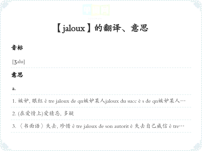 【jaloux】 联想:、 近义词:、 反义词: 联想词
