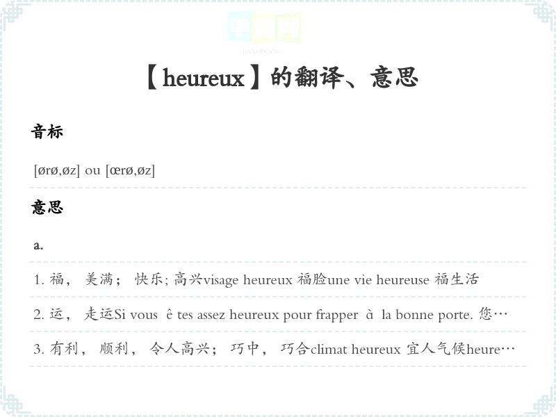【heureux】 形容词变化:、 副词变化:、 近义词:、 反义词: 联想词