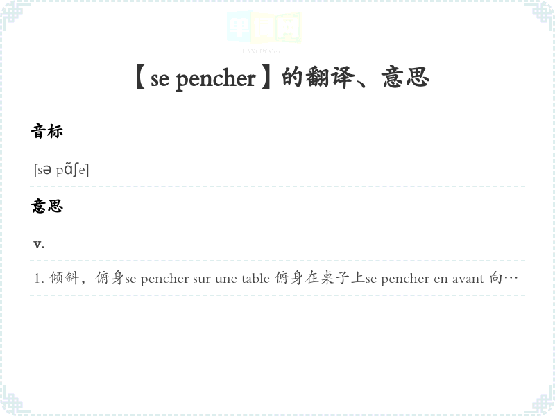 【se pencher】 助记:、 词根:、 联想、 名词化:、 词化:、 形容词化:、 近义词、 反义词、 同音、近音词 联想词