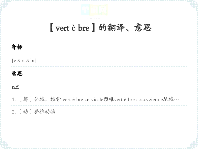 〔解〕脊椎,椎骨 vertèbre cervicale颈椎vertèbre coccygienne尾椎vertèbre lombaire腰椎vertèbre proéminente隆椎