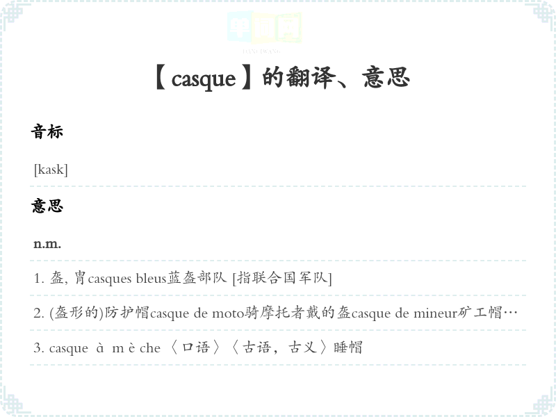【casque】 词源:、 词根:、 派:、 近义词、 同、近词 联想词