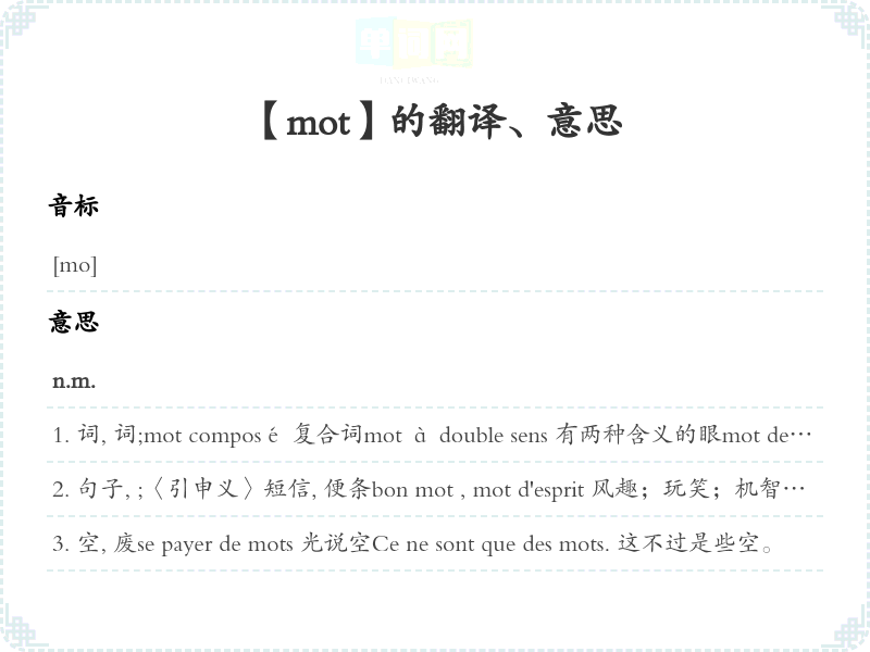 词, 词;mot composé 复合词mot à double sens 有两种含义的眼mot de plusieurs syllabes 多音节词un mot nouveau 新词un nouveau mot 生词groupe de mots 词组gros mot 粗眼;脏, 骂人grands mots 夸大的眼mot d'ordre 口令;口号mot de passe 口令le fin mot de l'affaire 底细, 内情le fin mot de l'histoire 故事的奥秘le mot de l'énigme 谜底le mot de cinq lettres 五个母的那个词 [指 merde]faire des mots croisés 做纵横填游戏avoir un mot sur le bout de la langue 一个眼到了嘴边 [指几乎想起, 一时说不出来]Orgueilleux, ce n'est pas le mot. 说骄傲吧, 这个词也不确切。chercher ses mots 寻找眼compter ses mots 装模作样地慢吞吞地讲jouer sur les mots 玩弄眼manger ses mots 说口齿不清ne pas souffler mot 一言不发se donner le mot 事先商量好, 串通好Il ne dit pas un mot. Il ne dit mot. 他一言不发。