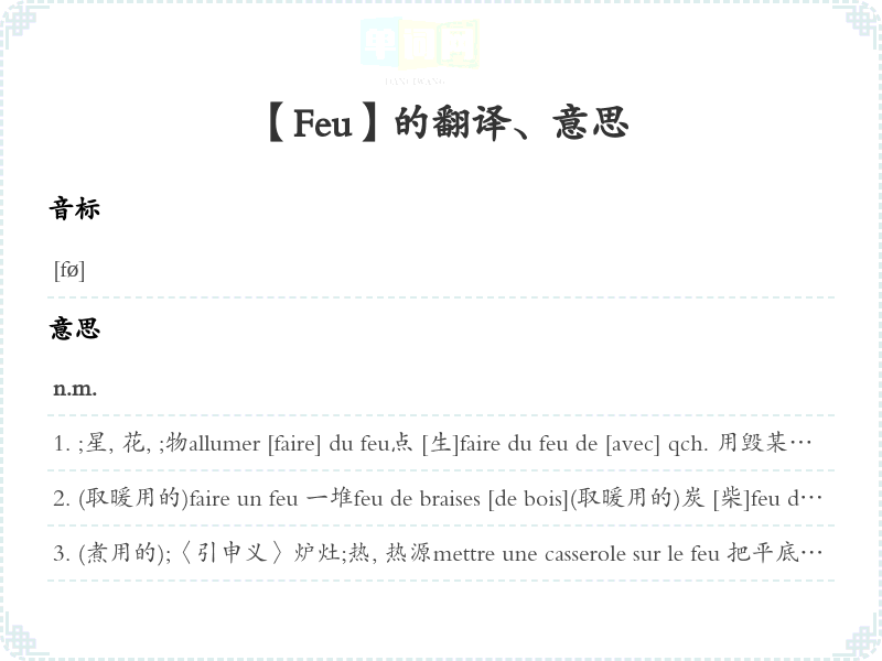 【Feu】 联想:、 近义词:、 反义词: 联想词