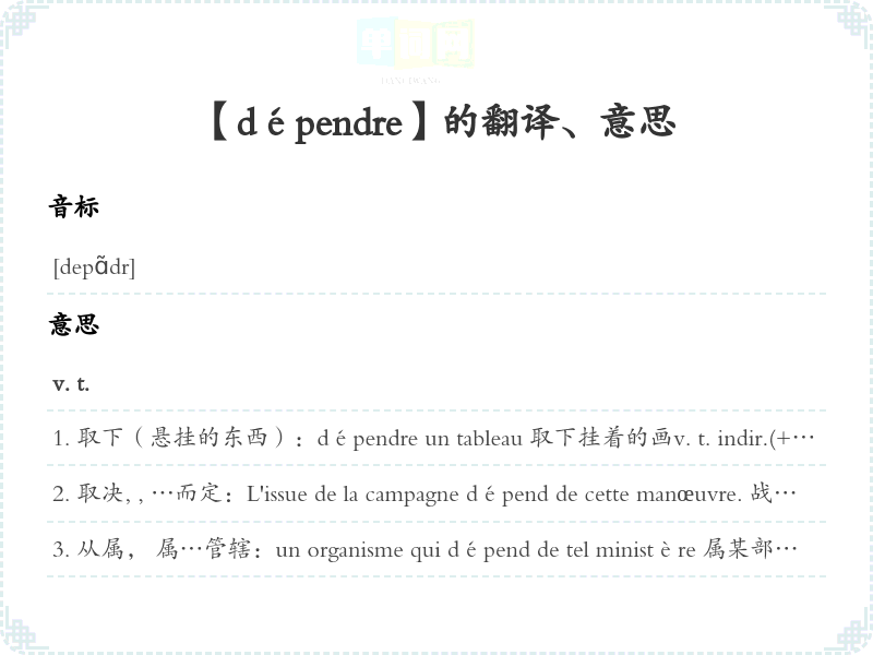 【dépendre】 助记:、 派生:、 用法:、 近义词:、 反义词: 联想词