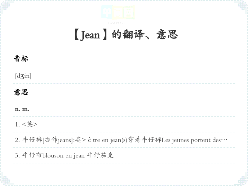 牛仔裤[亦作jeans]:英>être en jean(s)穿着牛仔裤Les jeunes portent des jeans. 年轻人穿牛仔裤。