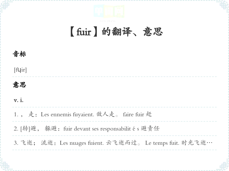 【fuir】 词根:、 派生:、 近义词:、 反义词: 联想词