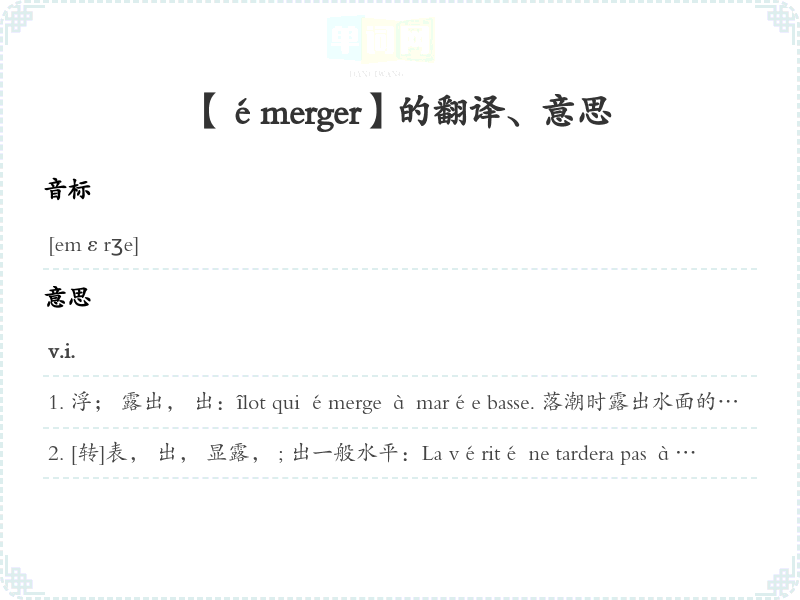 浮; 露出, 出:îlot qui émerge à marée basse. 落潮时露出水面的小岛Le soleil émerge de l'horizon. 太阳从地平线上出。