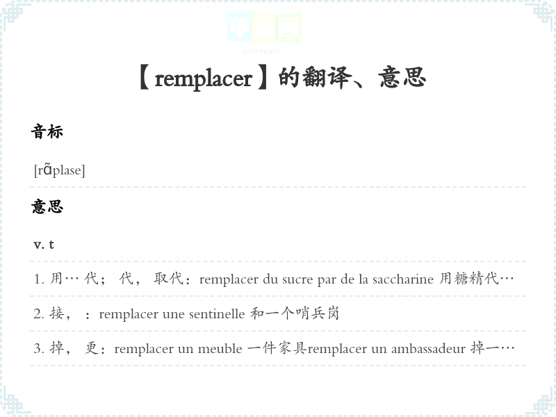 用… 代; 代, 取代:remplacer du sucre par de la saccharine 用糖精代糖La traction électrique remplace de plus en plus la traction à vapeur. 电力牵引逐步取代蒸汽牵引。 remplacer qn à une cérémonie 代某人参加一个仪式