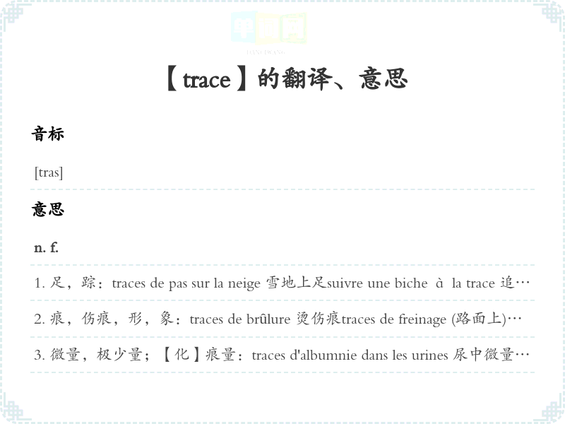 微量,极少量;【化】痕量:traces d'albumnie dans les urines 尿中微量蛋白质