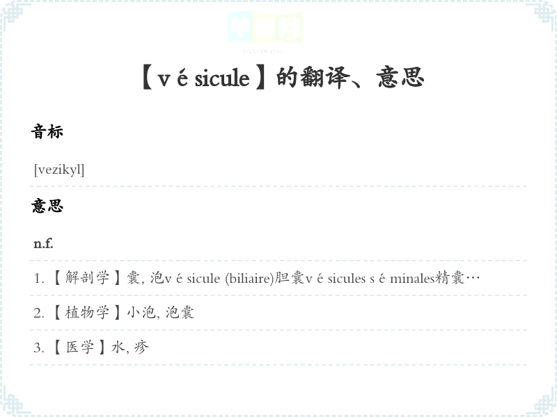 【解剖学】囊, 泡vésicule (biliaire)胆囊vésicules séminales精囊vésicules cérébrales脑泡