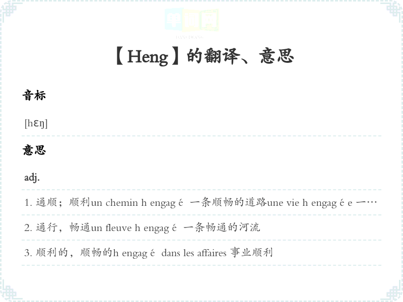 通顺;顺利un chemin h engagé 一条顺畅的道路une vie h engagée 一种顺利的生活