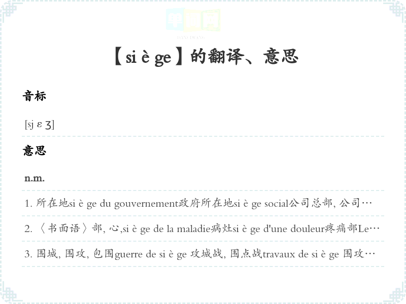 围城, 围攻, 包围guerre de siège 攻城战, 围点战travaux de siège 围攻工事mettre le siège devant une ville包围一城市lever le siège 撤围;〈义〉〈口语〉走开, 离去avoir son siège fait〈义〉已打定主意Mon siège est fait.〈义〉我主意已定。