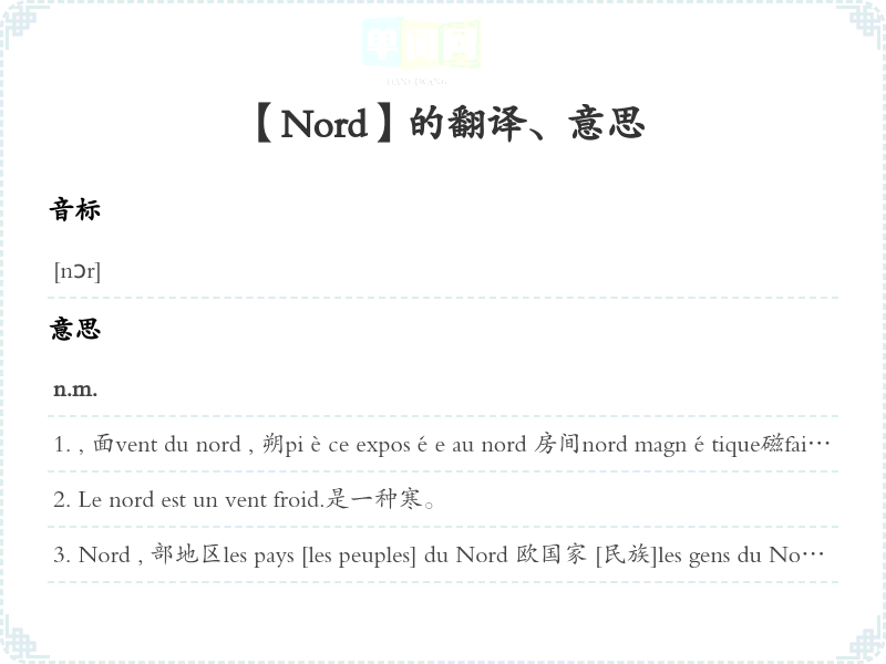 Nord , 部地区les pays [les peuples] du Nord 欧国家 [民族]les gens du Nord (法国的)人la gare du Nord (巴黎的)le Nord de la Chine中国的部la région du Nord (法国的)部地区le Grand Nord 极地带l'étoile du Nord 极星Afrique du Nord 非