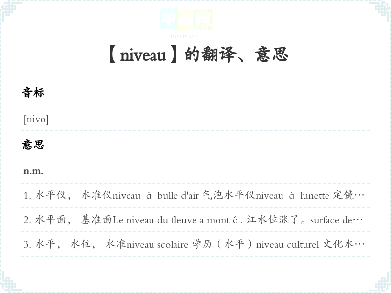 水平, 水位, 水准niveau scolaire 学历(水平)niveau culturel 文化水平niveau des prix 物价水平niveau de vie 生活水平