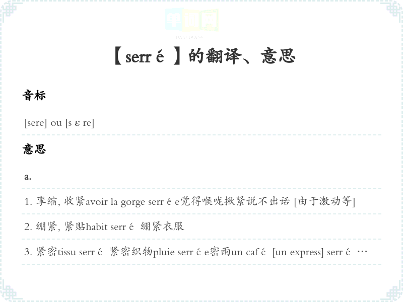 紧密tissu serré 紧密织物pluie serrée密雨un café [un express] serré 一杯浓咖啡une petite écriture fine et serrée细而密小字体cheval serré du devant [du derrière]前肢 [后肢] 紧靠马