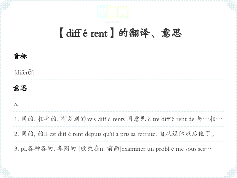 同的, 相异的, 有差别的avis différents 同意见être différent de 与…相同, 和…Cela est (tout) différent.〈口语〉这完全同了。这完全是另码事。